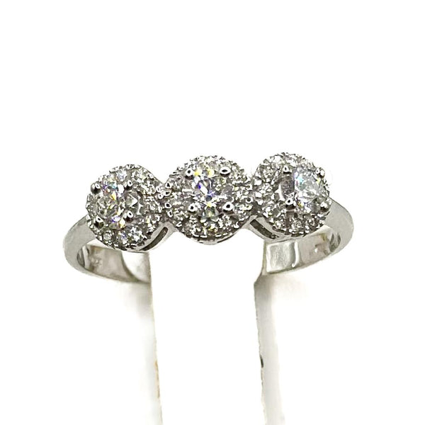 Anello in oro bianco 9 carati con tre cubic zirconia grandi contornati da zirconi più piccoli.