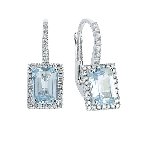 Orecchini in oro bianco 18 carati con acquemarine taglio ottagonale e diamanti bianchi naturali. Chiusura a monachella. Articolo completo di scatola e garanzia.