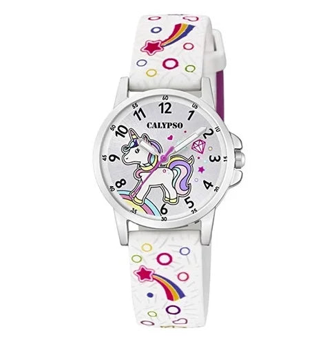 Orologio solo tempo da bambina della collezione Junior Collection, con cassa in accaio della dimensione di 27 mm e spessore di 8,7 mm. Il quadrante è silver raffigurante un unicorno colorato, cinturino in gomma di colore bianco con disegni colorati. La chiusura del cinturino è a fibbia, e ha una resistenza all'acqua di 5 atm.
