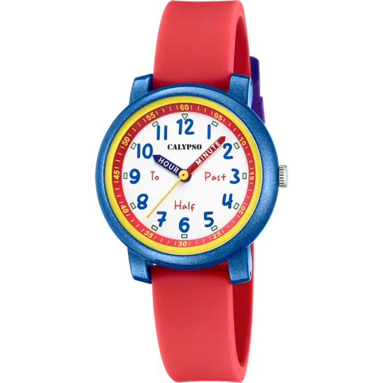 Orologio Calypso analogico per bambini solo tempo con cassa di dimensione 32 mm di colore blu. Quadrante con numeri arabi colorati. Movimento al quarzo. Cinturino in gomma rosso. Resistente all’acqua fino a 5 atm. Articolo completo di scatola e garanzia.