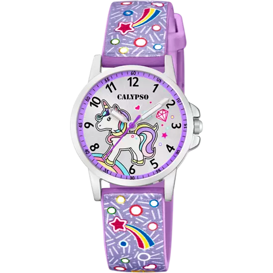 Orologio Calypso solo tempo da bambina della collezione Junior Collection, con cassa in acciaio della dimensione di 27 mm e spessore di 8,7 mm. Il quadrante è color argento raffigurante un unicorno colorato, cinturino in gomma di colore viola con disegni colorati. La chiusura del cinturino è a fibbia, e ha una resistenza all'acqua di 5 atm.