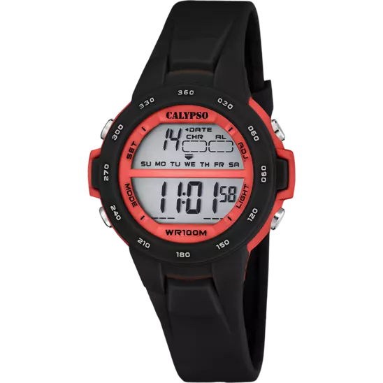 Orologio unisex Calypso della collezione Junior Collection realizzato con cassa in plastica color nero con un diametro di 39 mm.Il quadrante è color rosso. Ha un vetro minerale e la resistenza all'acqua è di 10 ATM.Il cinturino è realizzato in gomma color nero con una chiusura a fibbia ad ardiglione.
