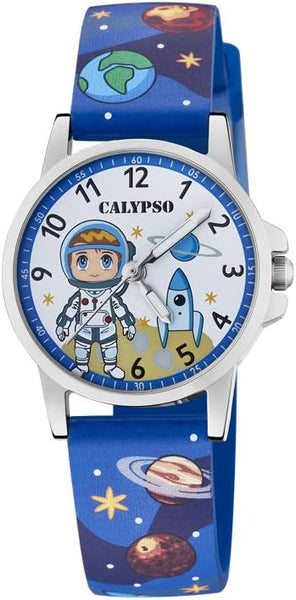 Orologio solo tempo da bambino con cinturino in silicone blu a fantasia e cassa e chiusura con fibbia ad ardiglione in acciaio 316 L. Il quadrante è tondo con un bambino vestito da astronauta e presenta indici con numeri arabi e tre lancette. Articolo completo di scatola e garanzia.