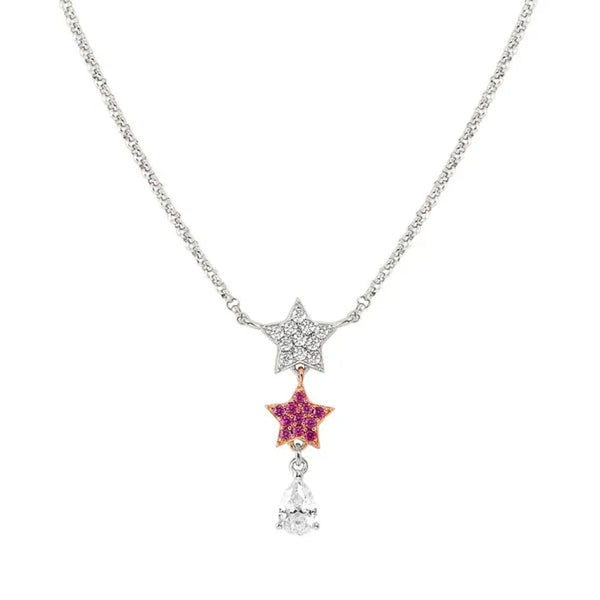 Collana da donna della collezione Lucentissima. Materiale: Argento rodiato bianco, Argento finitura Oro Rosa. Lunghezza min/max: 38 cm / 44 cm. Misura Pendenti 0.7 cm x 0.7 cm ; 0.8 cm x 0.8 cm ; 0.4 cm x 0.65 cm Pietre preziose Cubic Zirconia Misura Pietre 1,2x1,2 mm, 1,5x1,5 mm, 3x3 mm, 6x4 mm. Colore: Pietra Rosa, Bianco. Articolo completo di scaola e garanzia.