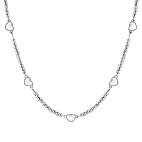 Collana girocollo da donna in acciaio inossidabile 316L con ciondoli passanti a forma di cuore con madreperla. Dimensioni cuore: 0,7 cm x 0,6 cm. Lunghezza regolabile da 38 cm a 42 cm con chiusura a moschettone. Articolo completo di scatola e garanzia.