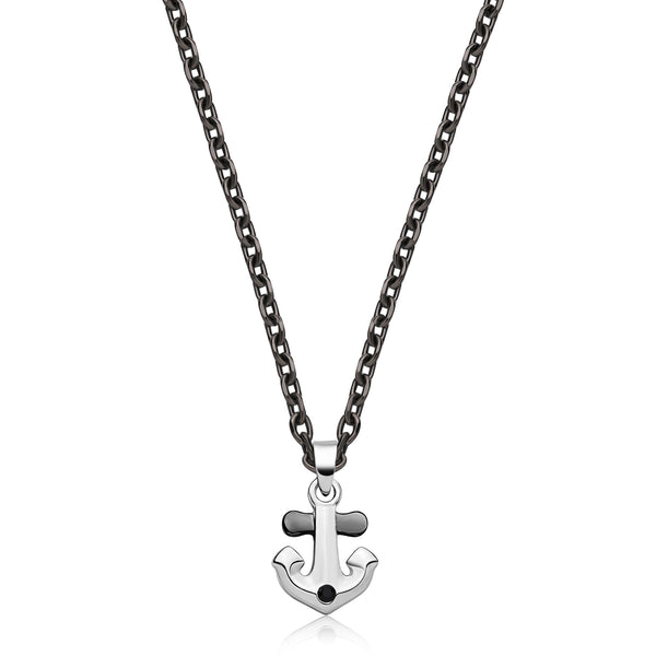Collana in acciaio 316L e finitura pvd colore rutenio con pendente a forma di ancora e zircone nero. Articolo completo di scatola e garanzia.