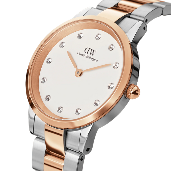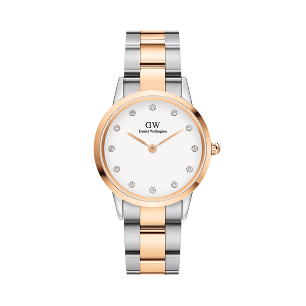 Orologio da donna Daniel Wellington Iconic Link Lumine con cassa in acciaio inossidabile di colore oro rosa di misura 32 mm, il quadrante è di colore bianco impreziosito da cristalli luccicanti. Cinturino in acciaio inossidabile di colore argento con rifiniture oro rosa. Completo di scatola e garanzia.