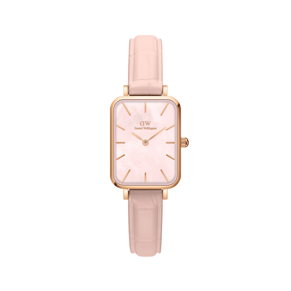 Orologio Daniel Wellington con cassa rettangolare in acciaio lucido inossidabile con placcatura oro rosa, quadrante rosa madreperla e cinturino in pelle di colore rosa. Movimento Japanese Quartz. Resistenza all'acqua fino a 3 atm. Completo di scatola e garanzia.