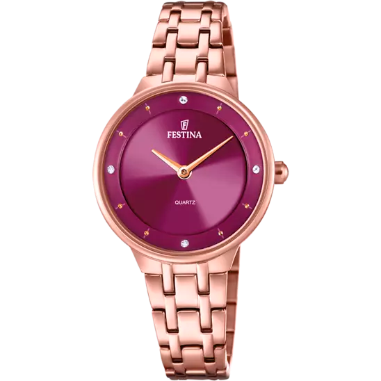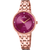 Orologio da donna con movimento al quarzo e funzioni di solo tempo.Cassa in acciaio inossidabile placcato oro rosa dal diametro di 30,5 mm.Quadrante viola con cristalli bianchi agli indici.Cinturino a maglie in acciaio anallergico rose gold largo 14 mm; chiusura deployante con pulsanti.Resistente all'acqua fino a 50 metri di profondità.