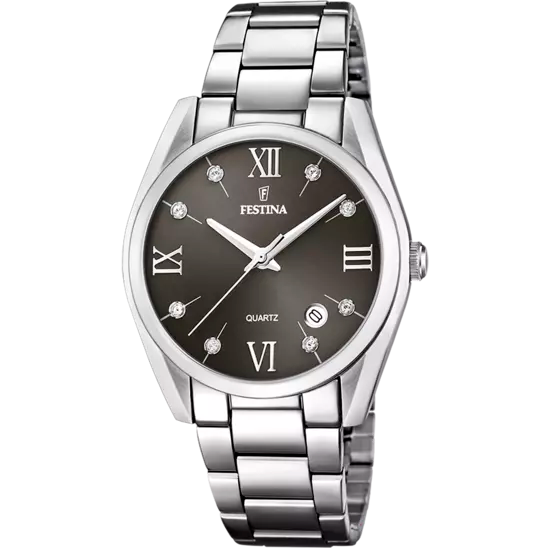 Orologio da donna Festina della collezione Boyfriend con movimento al quarzo e funzioni di solo tempo. Cassa in acciaio inossidabile dal diametro di 36,8 mm.Quadrante viola con effetto sunray, cristalli bianchi agli indici e numeri romani a ore 12, 3, 6 e 9. Cinturino a maglie in acciaio anallergico; chiusura deployante con pulsanti.Resistente all'acqua fino a 50 metri di profondità. Articolo completo di scatola e garanzia.