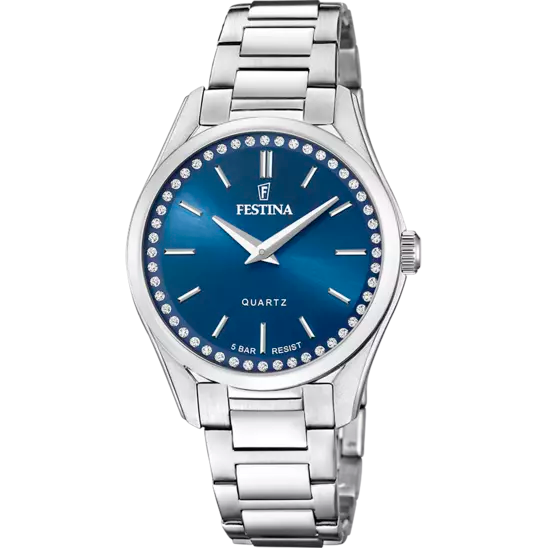 Orologio Festina da donna con movimento al quarzo e funzioni di solo tempo.Cassa in acciaio inox dal diametro di 35,5 mm e spessore di 7,5 mm.Quadrante blu con contorno di cristalli bianchi, indici a bastoni e lancette color argento.Cinturino a maglie in acciaio anallergico largo 16 mm; chiusura deployante con pulsanti.Resistente all'acqua fino a 50 metri di profondità. Articolo completo di scatola e garanzia.
