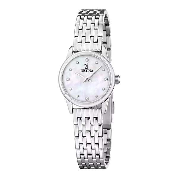 Orologio da donna Festina con cassa rotonda in acciaio inossidabile di diametro 23 mm e spessore 7,4 mm, quadrante madreperla con vetro minerale. Cinturino in acciaio inossidabile grigio con chiusura apribile. Movimento al quarzo Miyota 2025. Resistenza all'acqua fino a 5 atm. Articolo completo di scatola e garanzia.