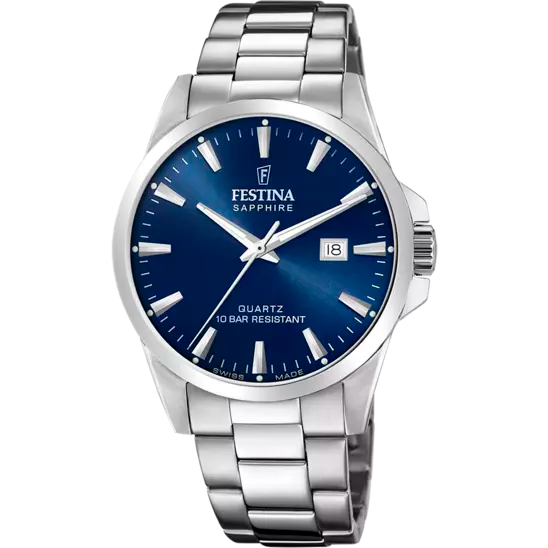 Orologio Festina da uomo, della collezione Swiss made, in acciaio inossidabile 316l, di colore azzurro, vetro in zaffiro, colore della sfera azzurro e indice acciaio laccato, con bracciale in acciaio inossidabile 316l con chiusura CAJ, con cassa rotonda, di dimensioni 4.1.0 e spessore 9,3, resistenza all'acqua fino a 10 ATM. Articolo completo di scatola e garanzia.