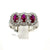 Anello in oro bianco 9 carati con 3 cubic zirconia rossi contornati da zirconi bianchi.