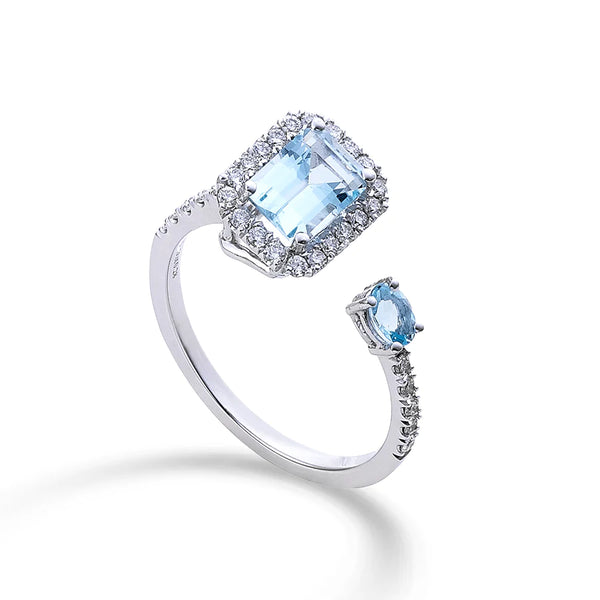 Anello io oro bianco 18 Kt con acquamarina di caratura totale 1,44 e diamanti colore G e purezza VS di caratura totale 0,27. Completo di scatola e garanzia.