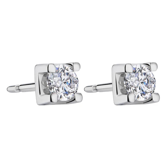 Orecchini punto luce in oro bianco 18kt. Collezione 'Quadro' della ditta World Diamond Group. Montatura quadrata con quattro griffe. Diamanti a taglio brillante per un totale di 0,44ct. Articolo completo di scatola e garanzia.
