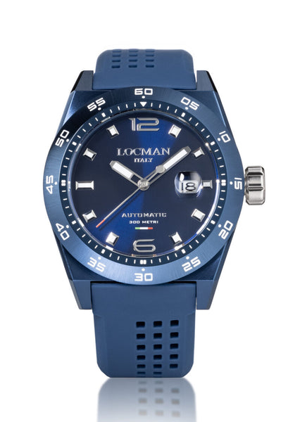 Orologio Locman con Movimento Automatico SIO1 con datario, Cassa in Acciaio e Titanio con trattamento PVD Blue, di dimensioni 46 mm x 12 mm, Quadrante con indici applicati, Ansa da 23mm, Vetro Zaffiro Anti-riflesso con lente, Impermeabilità 30 atm. Completo di scatola e garanzia.