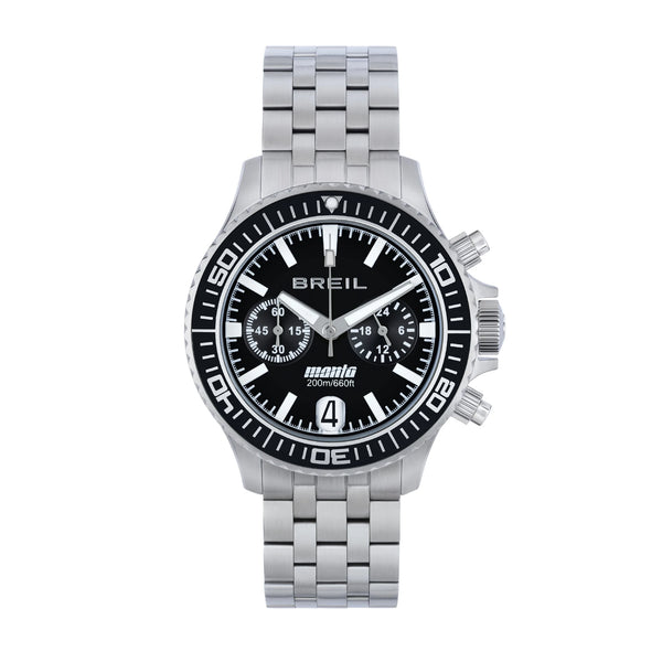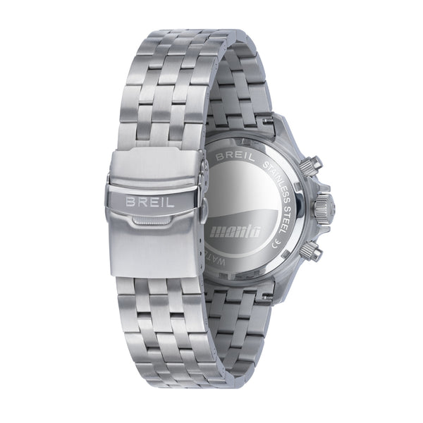 Orologio da uomo Breil della collezione Manta P.R.O con movimento al quarzo VK64-6H e funzioni di cronografo con data.Cassa rotonda in acciaio inox dal diametro di 42 mm; ghiera nera.Corona a vite per garantire maggiore impermeabilità.Quadrante nero con indici a bastoni, lancette con luminous e datario a ore 6.Cinturino in acciaio anallergico bilux; chiusura con fermaglio di sicurezza. Resistenza all'acqua fino a 200 metri di profondità.Articolo completo di scatola e garanzia.
