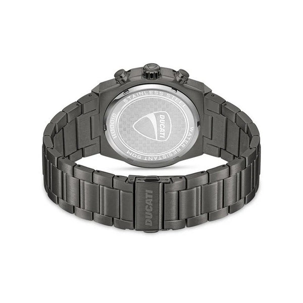 Orologio Locman Ducati Corse da uomo con movimento al quarzo funzione cronografo, cassa in acciaio trattamento PVD nero dimensioni 43,5 x 45,5 mm. Bracciale deployante in acciaio con trattamento PVD nero apertura con pulsanti e logo Ducati, quadrante nero con dettagli e logo Ducati bianchi, resistente all' acqua fino a 5 Atm. Articolo completo di scatola e garanzia.