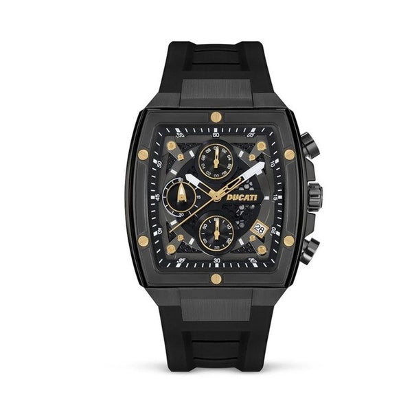 Orologio Ducati Corse by Locman cronografo con cassa tonneau da 40mm in acciaio trattato IP nero con quadrante nero e finiture dorate, cinturino in silicone nero. Articolo completo di scatola e garanzia.