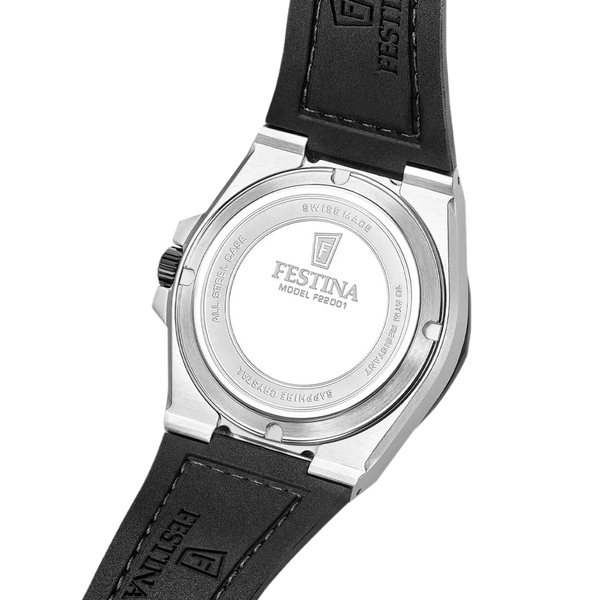 Orologio da uomo Festina con cassa rotonda in acciaio inossidabile di diametro 42 mm e spessore 11,2 mm. Quadrante nero con vetro zaffiro. Cinturino in pelle nero con chiusura a fibbia. Movimento al quarzo Ronda 715. Resistenza all'acqua fino a 10 atm. Articolo completo di scatola e garanzia.