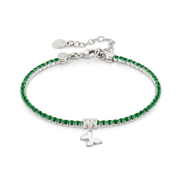 Bracciale in argento 925 anallergico placcato rodio bianco con cubic zirconia Verdi. Pendente Farfalla. Lunghezza 20 cm messa a misura 16.