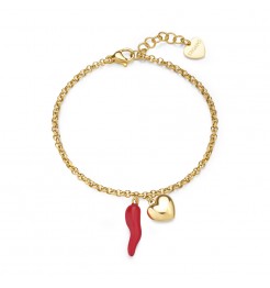 Braccialetto da donna della collezione Feelings realizzato in acciaio anallergico 316L con finitura dorata. Pendente a forma di cornetto con smalto rosso e cuore laterale.Lunghezza di 18,5 cm, regolabile. Chiusura a moschettone. Appartiene alla collezione Feelings. Completo di scatola e garanzia.