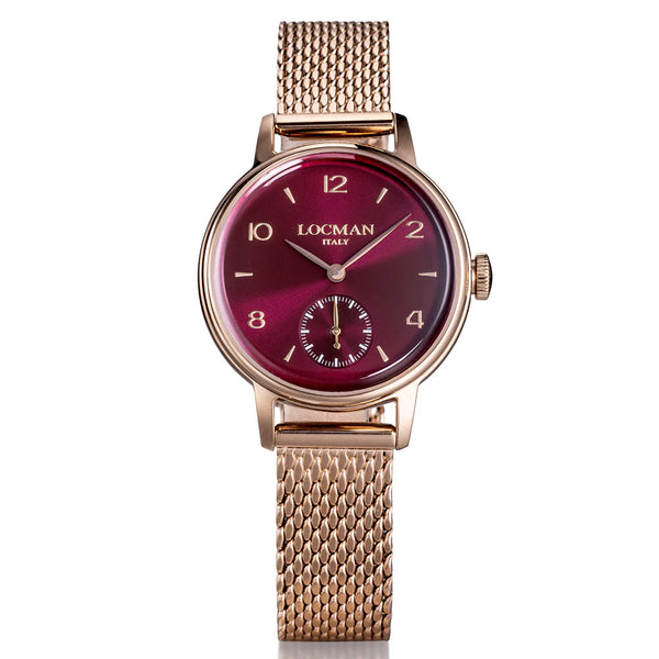 L' Orologio Donna Locman 1960 solo tempo ha una cassa in acciaio PVD di colore rose gold di diametro 32 mm, quadrante di colore rosso e vetro minerale antigraffio con trattamento in zaffiro. Cinturino in maglia milanese di colore rose gold. Movimento al quarzo e resistenza all'acqua fino a 5 atmosfere. Articolo completo di scatola e garanzia.