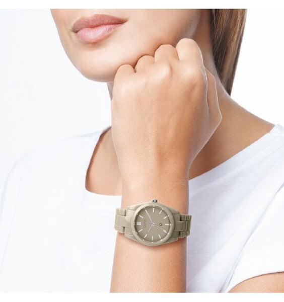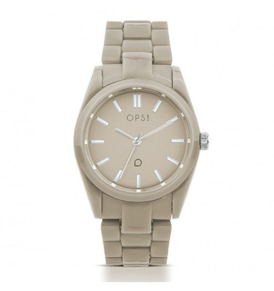 Cassa in plastica beige dal diametro di 36 mm. Quadrante beige con indici a bastoni e logo e lancette silver. Cinturino a maglie in plastica beige; chiusura deployante con pulsanti.