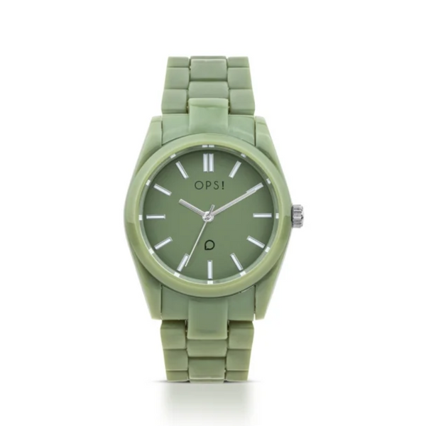 Orologio da donna Ops Objects della collezione Vivid. Il movimento dell'orologio è al quarzo. La cassa è realizzata in plastica di colore verde militare, il diametro è di 36 mm. Il bracciale è realizzato in plastica di colore verde militare. Il quadrante è di colore verde militare. La resistenza all'acqua è di 5 ATM. Articolo completo di scatola e garanzia.