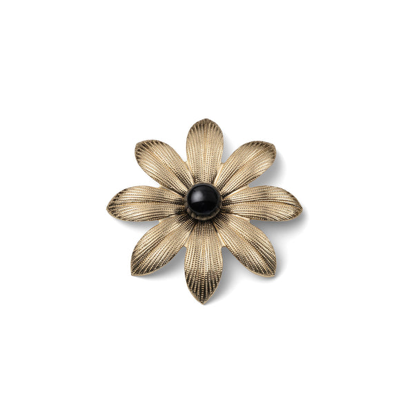Spilla a forma di fiore grande dorato con perla nera centrale. Collezione fashion Spille.Da appuntare su giacche, cappotti, sciarpe e borse, le spille sono gli accessori perfetti per esprimere la propria unicità senza lasciare nulla al caso. Un gioiello dal design a fiore iperfemminile e finemente lavorato, ideale per impreziosire ogni look con un tocco sofisticato ed originale.Placcatura in oro 24kt.