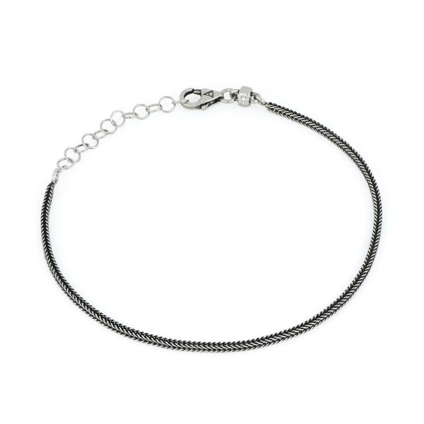 Bracciale per uomo in argento 925 caratterizzato dalla finitura brunita in palladio e oro nero. La catena in maglia coda di volpe è impreziosita in prossimità del moschettone da un diamante naturale. È dotato di un moschettone con perno girevole che ne agevola la chiusura. Il gioiello ha una catena di estensione di 4 cm che permette di regolarne la misura. Il diametro della maglia è di 1,7 mm. Articolo completo di scatola e garanzia.