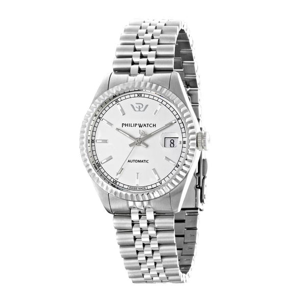 Orologio Philip Watch della serie Caribe con cassa in acciaio color argento di misura 46x38.8mm e spessore 11 mm. Vetro zaffiro. Bracciale in metallo color argento con chiusura deployment. Movimento automatico. Completo di scatola e garanzia.