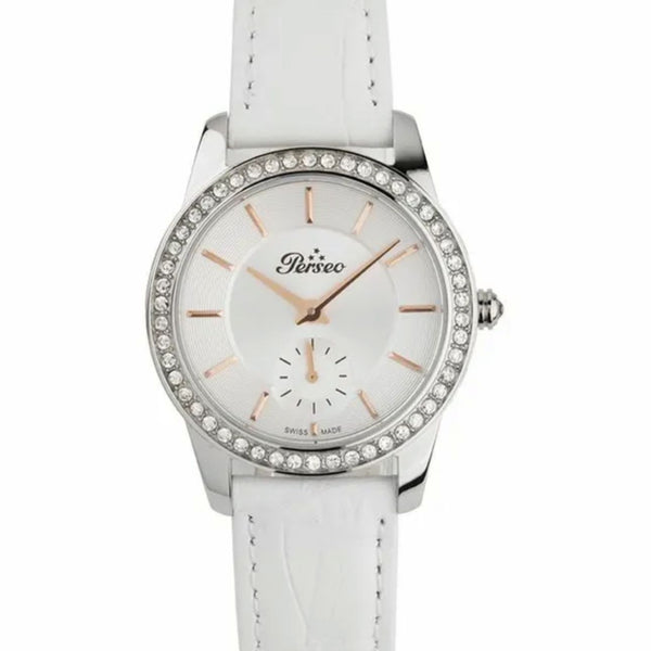 Cassa in acciaio, quadrante silver con piccoli secondi a ore 6, lunetta impreziosita da Swarovski.