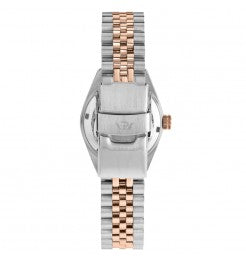 Orologio da donna Philip Watch della collezione Urban con movimento al quarzo e funzioni di solo tempo con data.Cassa in acciaio inox dal diametro di 31 mm e spessore di 9,15 mm. Lunetta zigrinata placcata oro rosa. Fondello e corona a vite per garantire maggiore impermeabilità.Quadrante analogico rosso ciliegia con indici a bastoni e numeri romani; datario a ore 3 con lente di ingrandimento. Vetro zaffiro. Cinturino jubilee bicolore in acciaio anallergico silver e oro rosa; chiusura deployante con pulsanti. Resistente all'acqua fino a 100 metri di profondità.Articolo completo di scatola e garanzia.