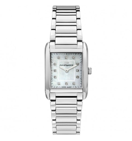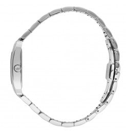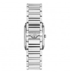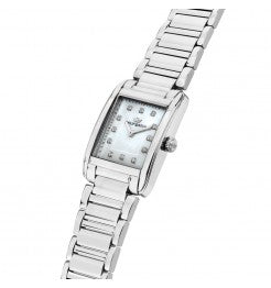 Orologio da donna della collezione Museum con movimento al quarzo RONDA 1032 e funzioni di solo tempo. Cassa squadrata in acciaio inox dalle dimensioni di 34 mm x 24,7 mm. Vetro zaffiro a doppia curvatura. Quadrante analogico in madreperla con diamanti bianchi agli indici. Cinturino in acciaio anallergico; chiusura deployante con pulsanti. Resistente all'acqua fino a 30 metri di profondità. Completo di scatola e garanzia.