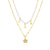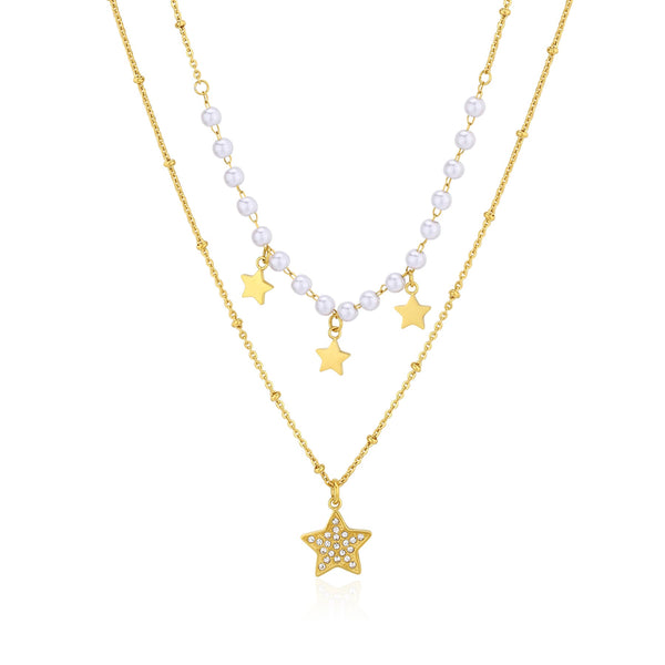 Collana doppio filo in acciaio 316L, finitura pvd oro 14K con pendenti a forma di stelle, perle di conchiglia e cristalli.