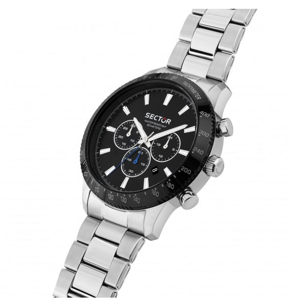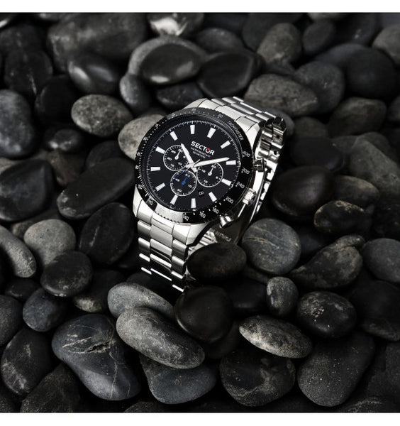 Orologio da uomo Sector della collezione 270 multifunzione con movimento al quarzo JS25. Cassa in acciaio inossidabile del diametro di 45 mm. Lunetta nera.Quadrante nero con indici a bastoni e logo nella parte alta. Datario tra le ore 4 e 5.Cinturino in acciaio anallergico; chiusura deployante con pulsanti.Resistente all'acqua fino a 50 metri di profondità.Articolo completo di scatola e garanzia.