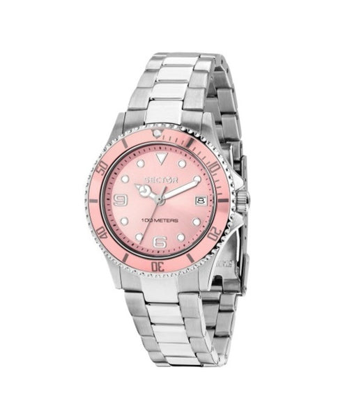 Orologio da donna e ragazza con movimento al quarzo VJ32 e funzioni di solo tempo con data. Cassa in acciaio inossidabile del diametro di 35 mm. Quadrante analogico rosa con indici applicati e datario a ore 3. Cinturino in acciaio anallergico; chiusura deployante con pulsanti. Resistente all’acqua fino a 100 metri di profondità. Appartiene alla collezione 230. Articolo completo di scatola e garanzia.
