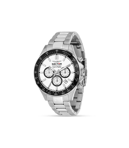 Orologio Sector 230 con cassa in acciaio di misura 43 mm e spessore 12 mm. Cinturino in metallo color argento. Vetro minerale e resistenza all'acqua fino a 10 atm. Completo di scatola e garanzia.