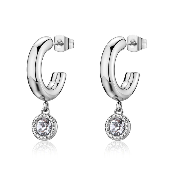 Orecchini a cerchietto in acciaio 316L con cristalli pendenti. Articolo completo di scatola e garanzia.
