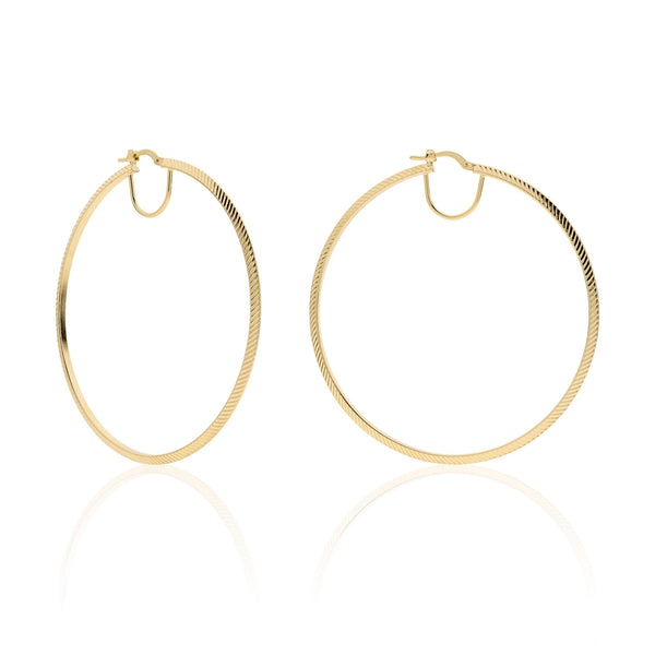 Orecchini a cerchio in finitura diamantata. Chiusura a baionetta. Diametro 6,00 cm. Articolo completo di scatola e garanzia.