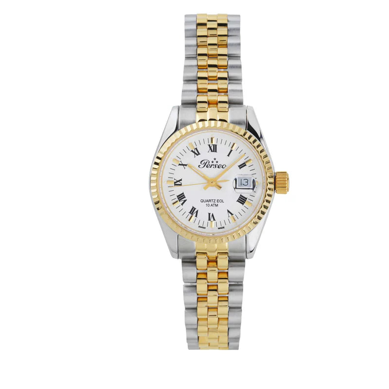 Orologio da donna classico di splendido impatto estetico. Cassa e bracciale in acciaio inossidabile con lunetta zigrinata placcata oro giallo e inserti del bracciale dorati. Vetro zaffiro antigraffio. Quadrante bianco con lancette dorate e numeri romani neri. Diametro di cassa 30 mm. Movimento al quarzo Ronda Swiss made. con secondi al centro e data a ore 3. Bracciale in acciaio con chiusura a cassetta. Peso orologio 80 gr. Corona e fondo a vite con tenuta 10 atm. 100 metri. Articolo completo di scatola e garanzia.