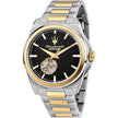 Orologio solo tempo da uomo Maserati della collezione Velocità con movimento automatico, cassa 41 mm in acciaio inossidabile, lunetta in PVD gold finitura satinata, spessore della cassa 12.70 mm, quadrante analogico nero, indici e lancette con inserto luminescente in modo che l'ora sia leggibile anche in condizioni di scarsa illuminazione, contatore trasparente ad ore 7 con movimento a vista, fondello e corona a vite per una maggiore garanzia di impermeabilità e vetro minerale. Fondello con oblò centrale trasparente e movimento a vista. Il cinturino è in acciaio inossidabile con inserto centrale in PVD gold e monta una chiusura deployante con apertura a doppio pulsante. Orologio impermeabile fino a 10 ATM. Articolo completo di scatola e garanzia.